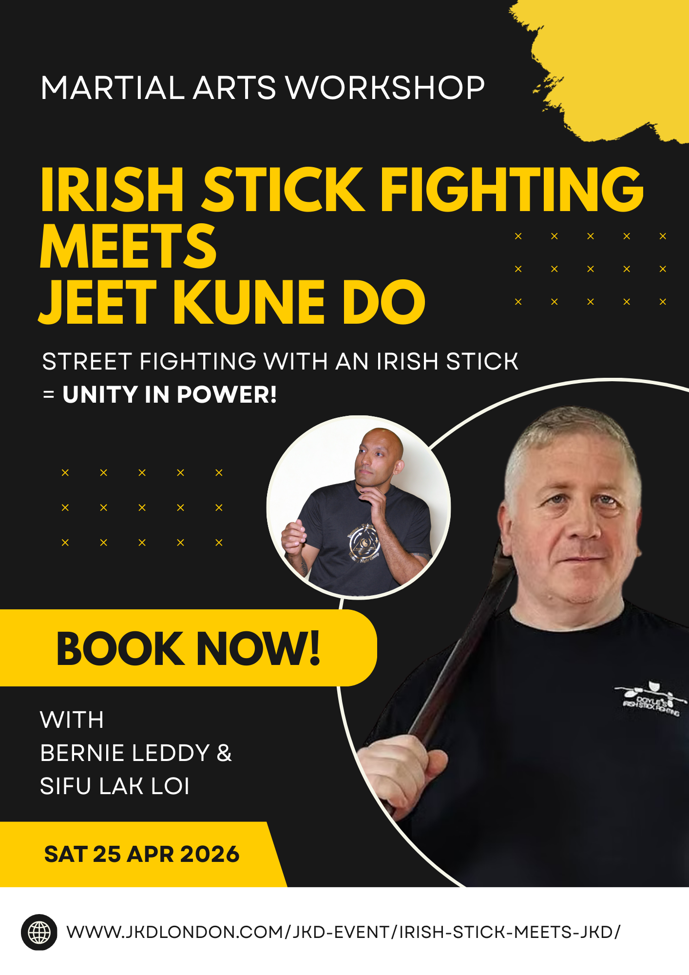 We are hosting the FIRST EVER special 1-day workshop: Irish Stick Fighting Meets Bruce Lee’s Jeet Kune Do – Sat 25 April 2026 with the legendary Bernie Leddy and Sifu Lak Loi.